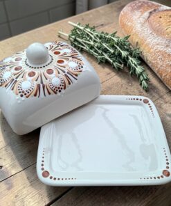 Vigyél meghitt, természetközeli hangulatot a reggelizőasztalodra! Ez a hófehér kerámia vajtartó a rozsdabarna, az okkersárga és a mélybarna meleg árnyalataival, kézzel festett mandala mintával készült. A precíz pontozó technika (dot art) révén a minta érezhetően domborodik a felületen, igazi kézműves remekművet alkotva.
