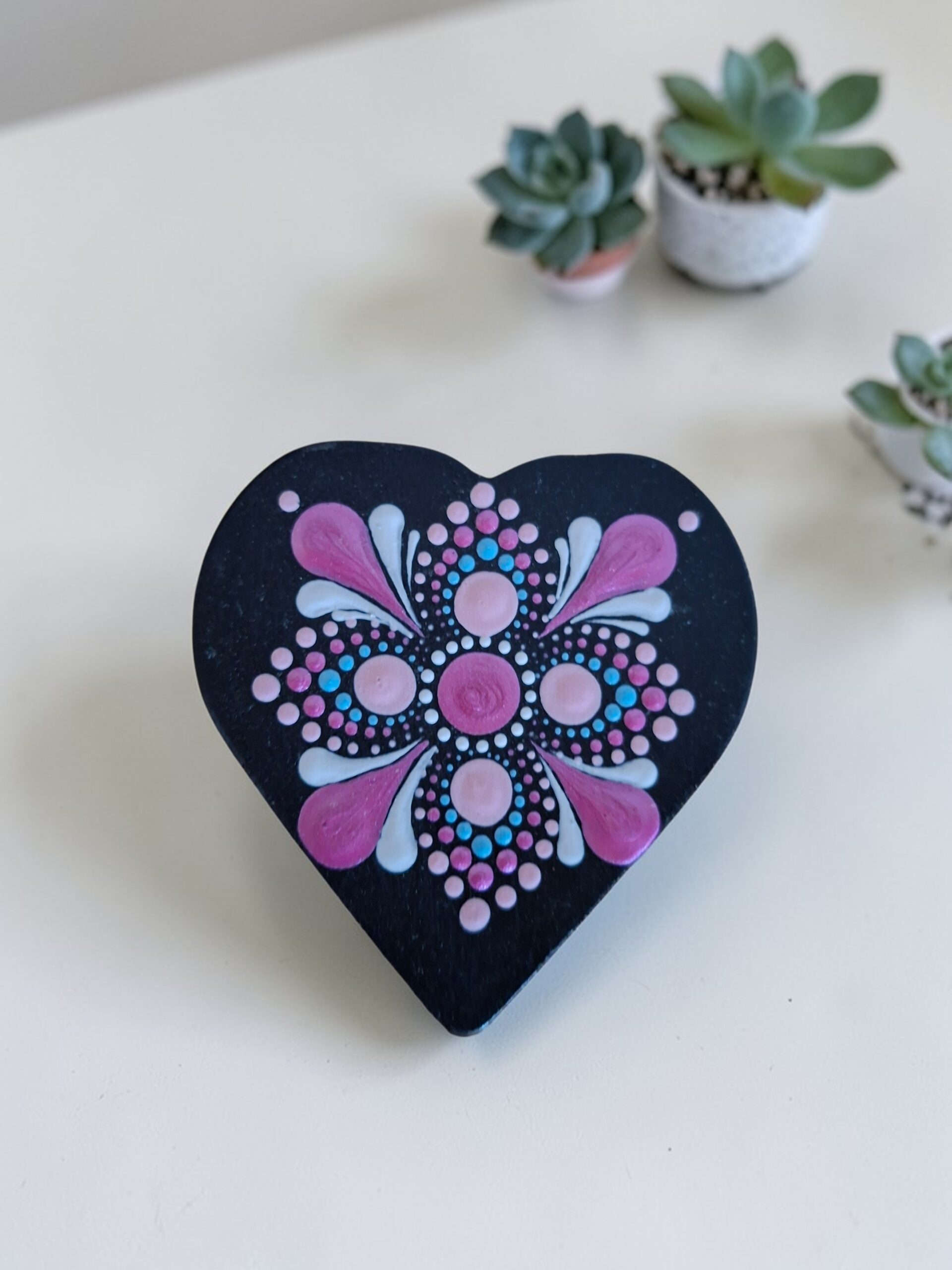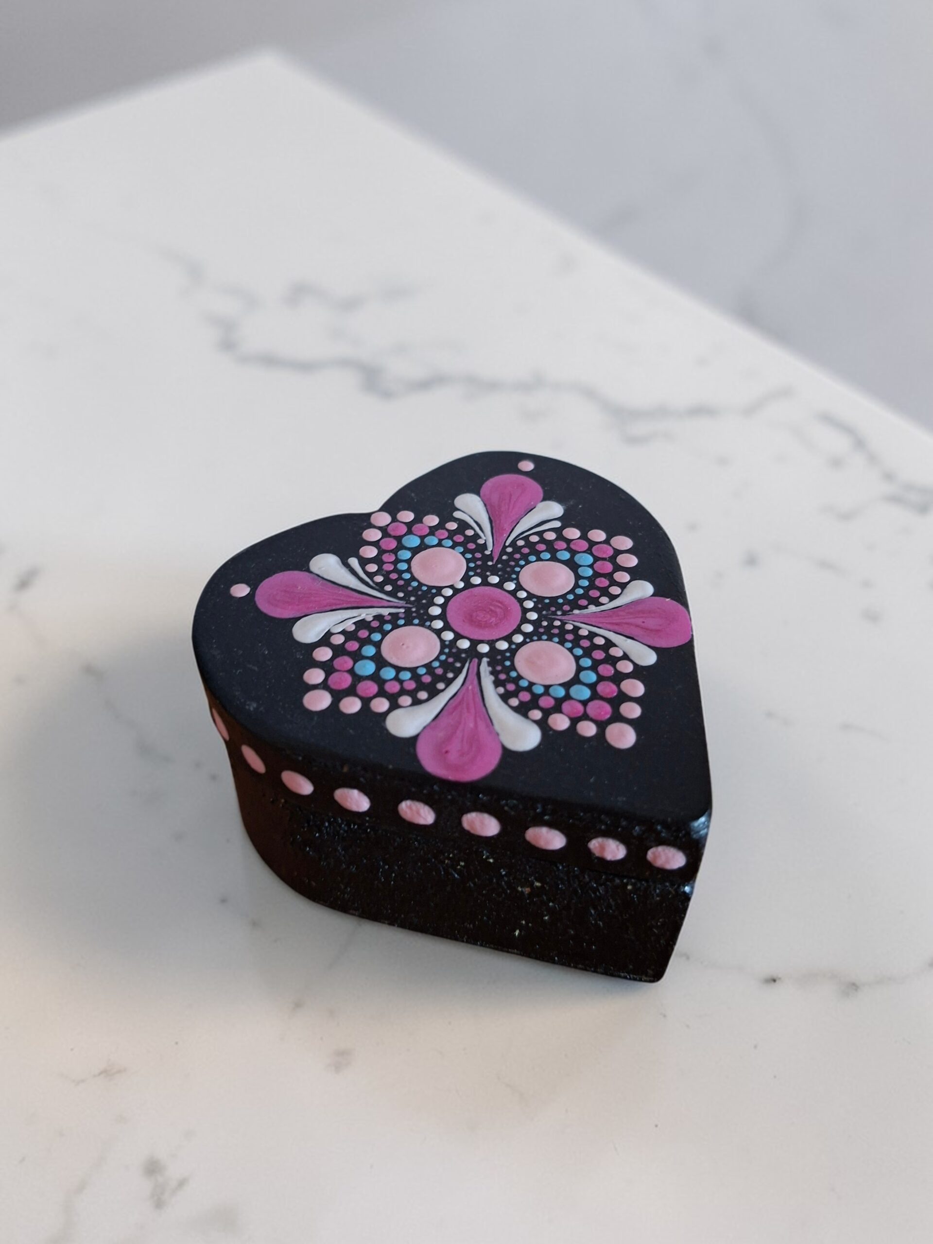 Kézzel festett mandala mintájú, szív alakú ékszeres doboz.
